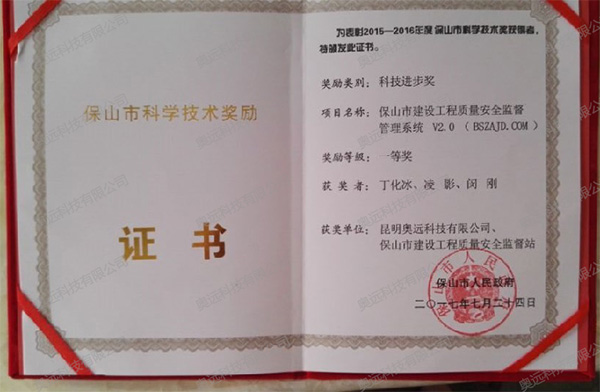 ? 《保山市建設(shè)工程質(zhì)量安全監(jiān)督管理系統(tǒng)》榮獲保山市科學(xué)技術(shù)一等獎(jiǎng)